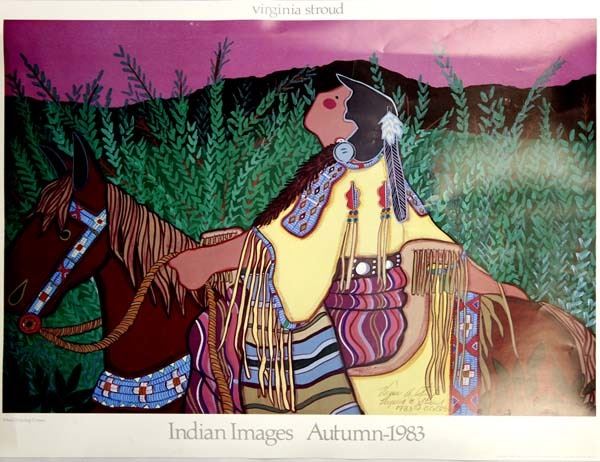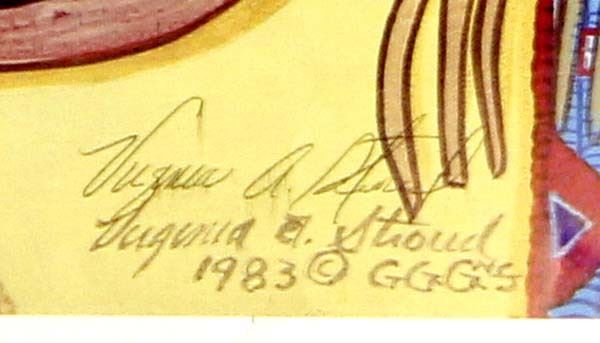 1983 Native American Cherokee-Muscogee Virginia A. Stroud Signed Print ''When Evening Comes'', measures 18'' x 27'', can be rolled to ship, FYI: ''Virginia Alice Stroud (born 1951) is a Cherokee-Muscogee Creek painter from Oklahoma. She is an enrolled member of the United Keetoowah Band of Cherokee Indians.