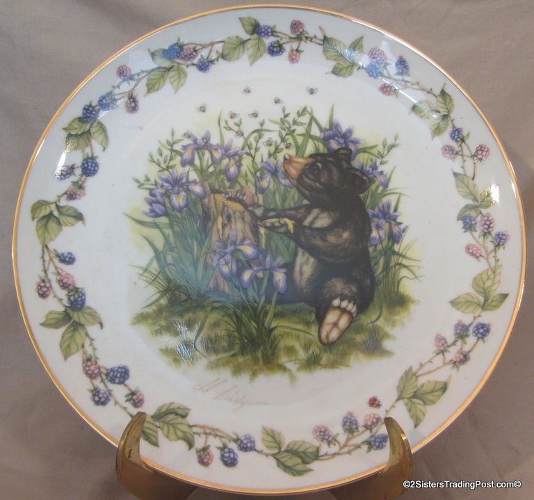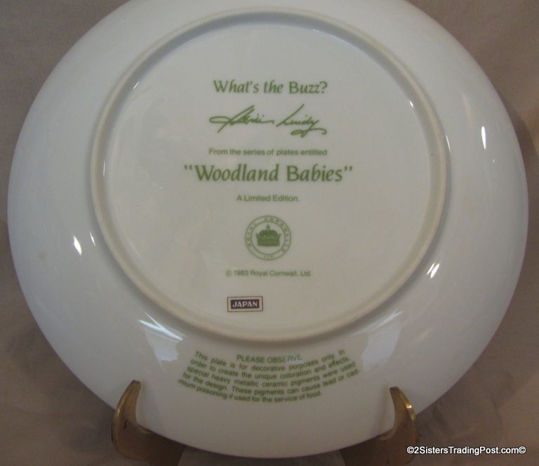 9 1/4" plate, dated 1983 'What's The Buzz' is one of the plates in the series of plates entitled 'Woodland Babies'. These plates are hand-bordered in 24K gold and are limited edition plates by Royal Cornwall, Ltd and designed by nature artist Heidi Lindy. The plate is in the original box with COA. (Please see images for details)