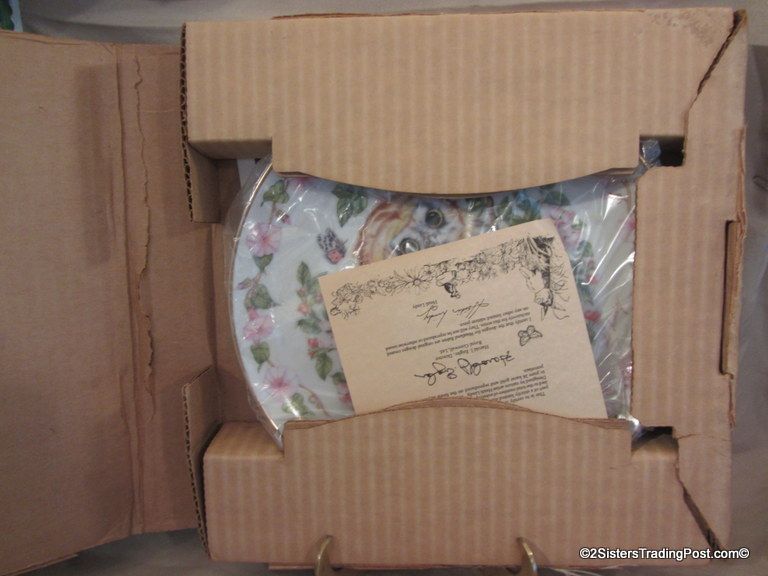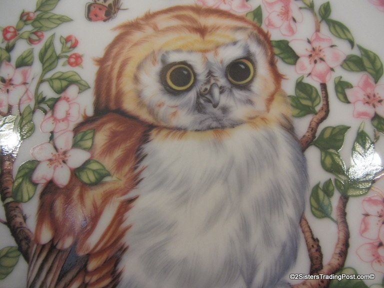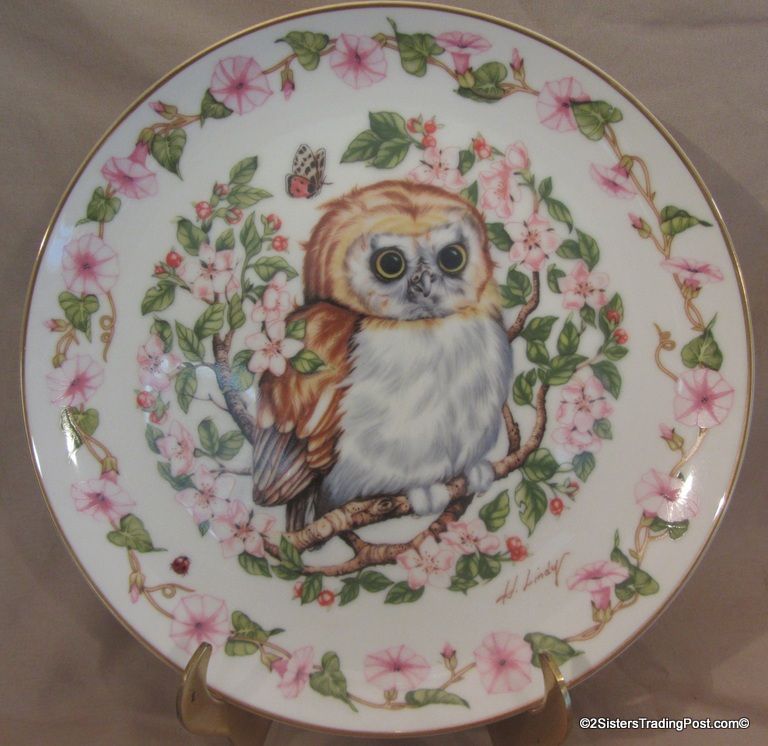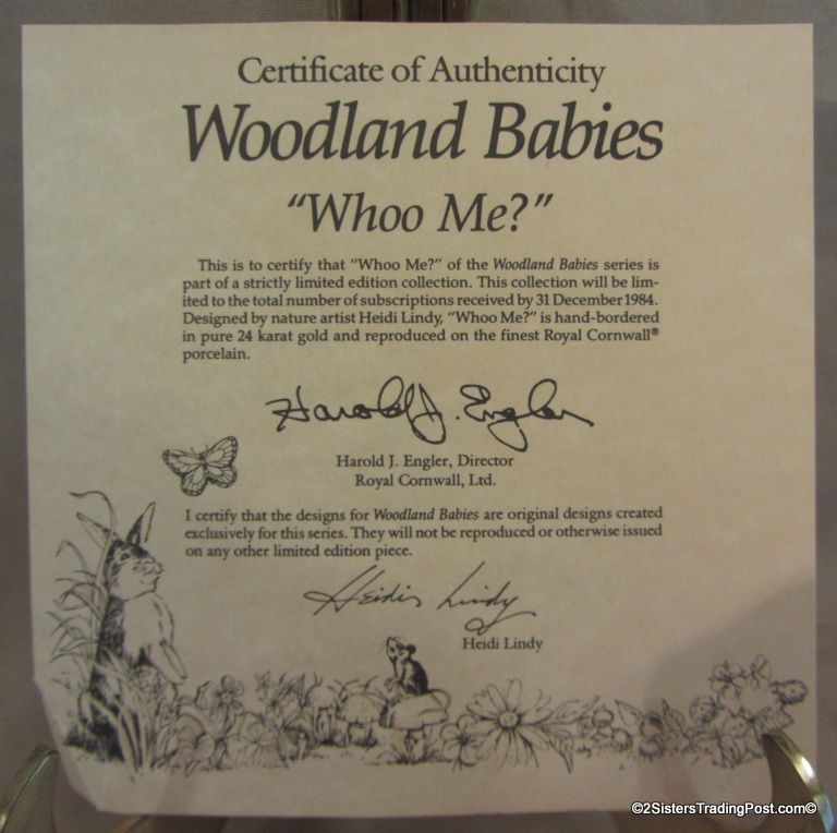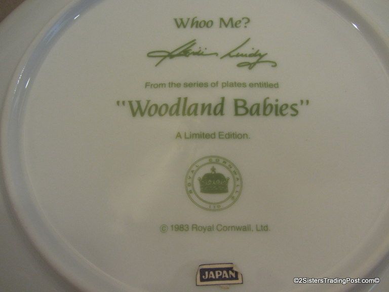9 1/4" plate, dated 1983 'Whoo Me?' is one of the plates in the series of plates entitled 'Woodland Babies'. These plates are hand-bordered in 24K gold and are limited edition plates by Royal Cornwall, Ltd and designed by nature artist Heidi Lindy. The plate is in the original box with COA. (Please see images for details)