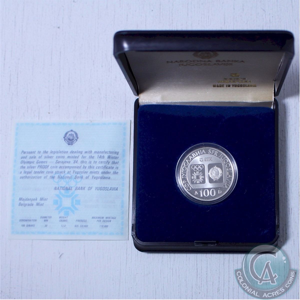 1983 Yugoslavia 100 Dinars 14th Winter Olympic Games Sterling Silver Proof Coin with display box and certificate.