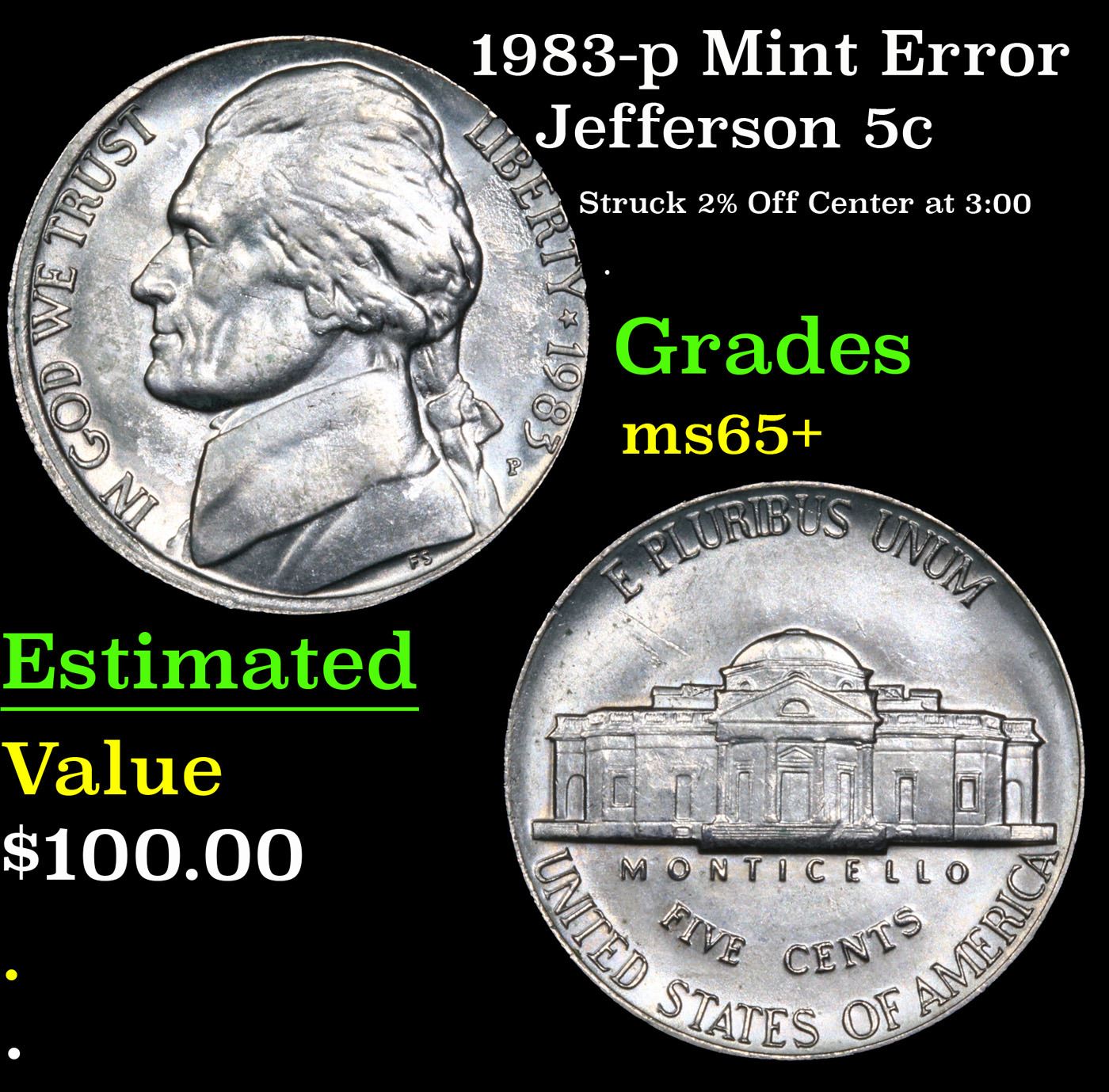 1983-p Mint Error Jefferson Nickel 5c Grades GEM+ Unc.
