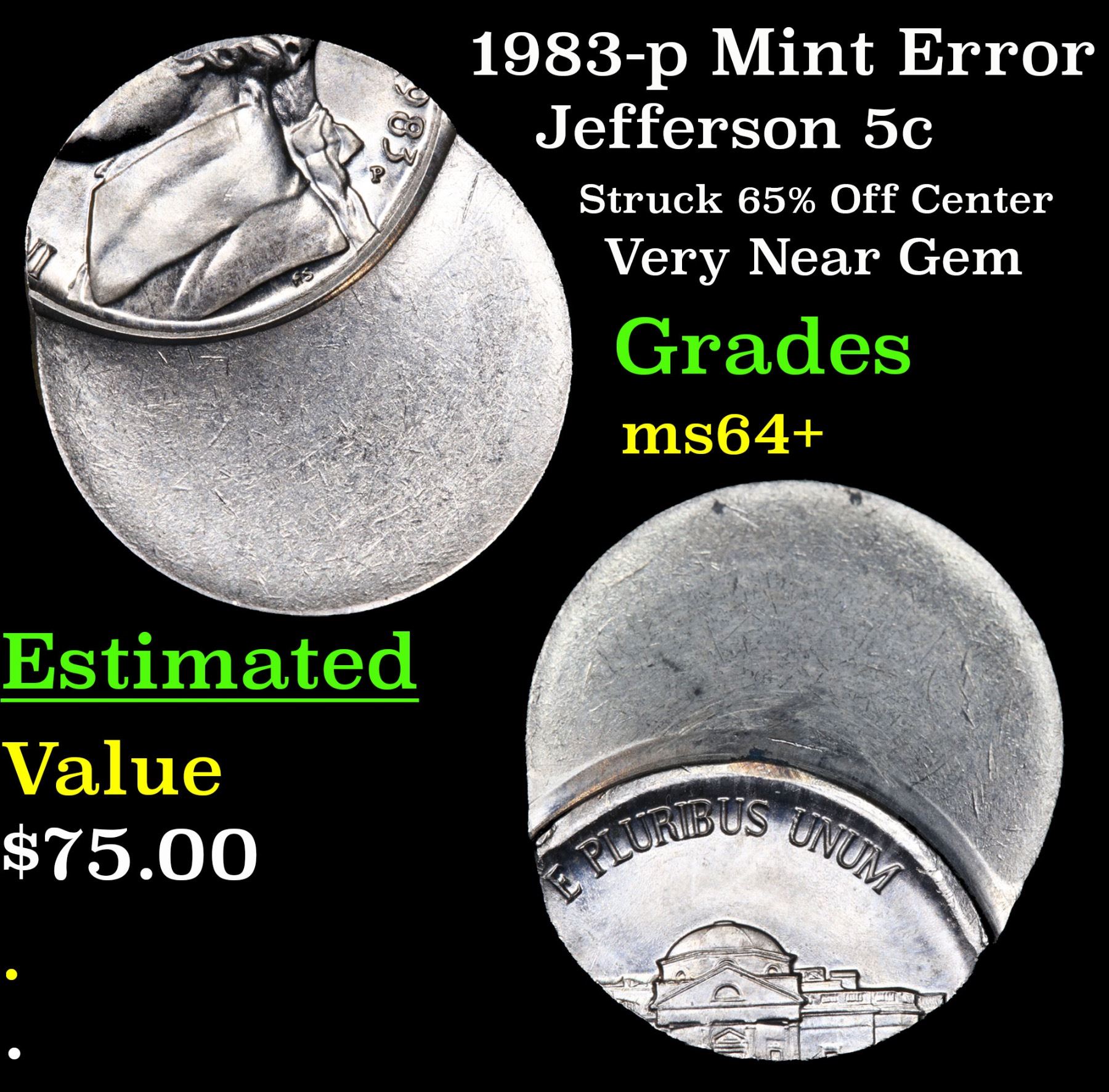 1983-p Mint Error Struck 65% Off Center Very Near Gem Jefferson Nickel 5c Grades Choice+ Unc.