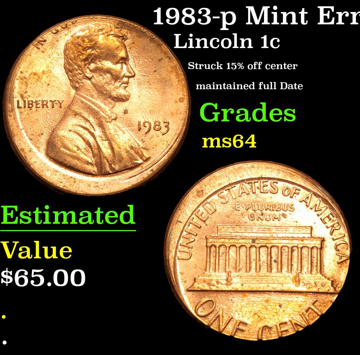 1983-p Mint Error Struck 15% off center maintained full Date Lincoln Cent 1c Grades Choice Unc.