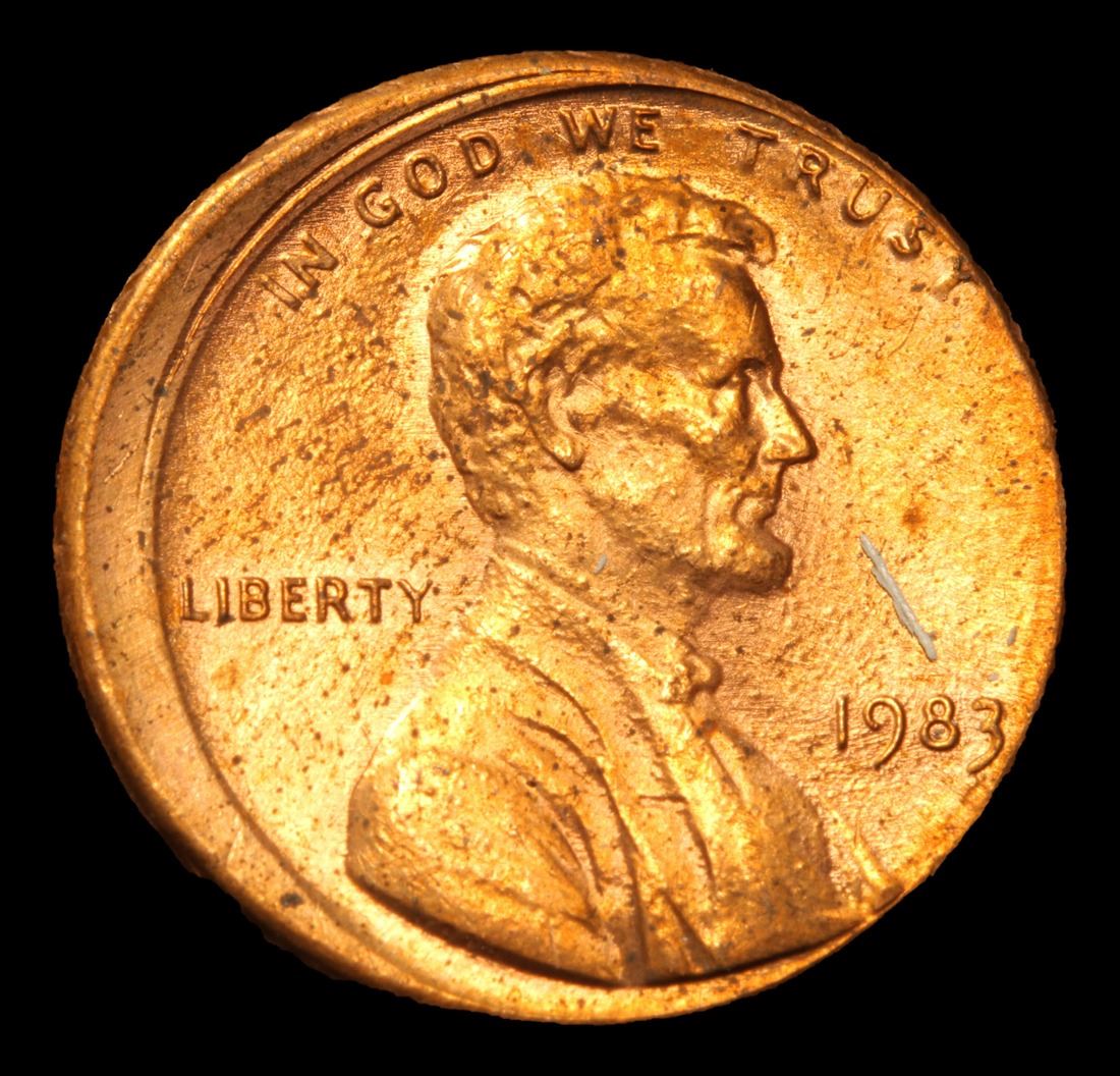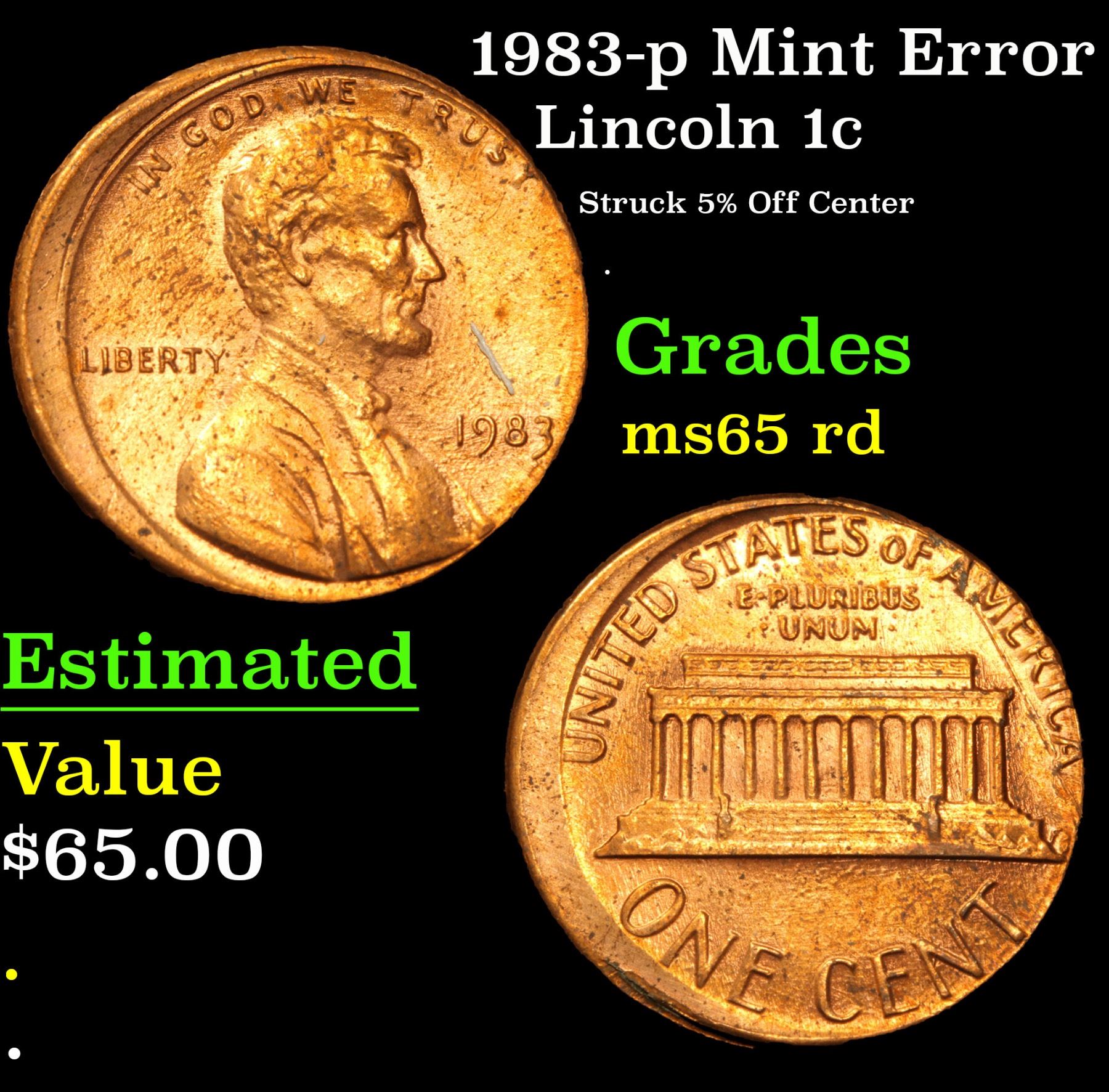 1983-p Mint Error Struck 5% Off Center . Lincoln Cent 1c Grades GEM Unc RD.