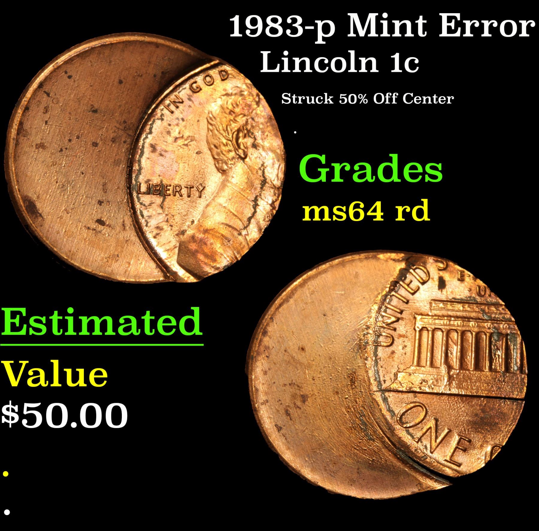 1983-p Mint Error Struck 50% Off Center . Lincoln Cent 1c Grades Choice Unc RD.