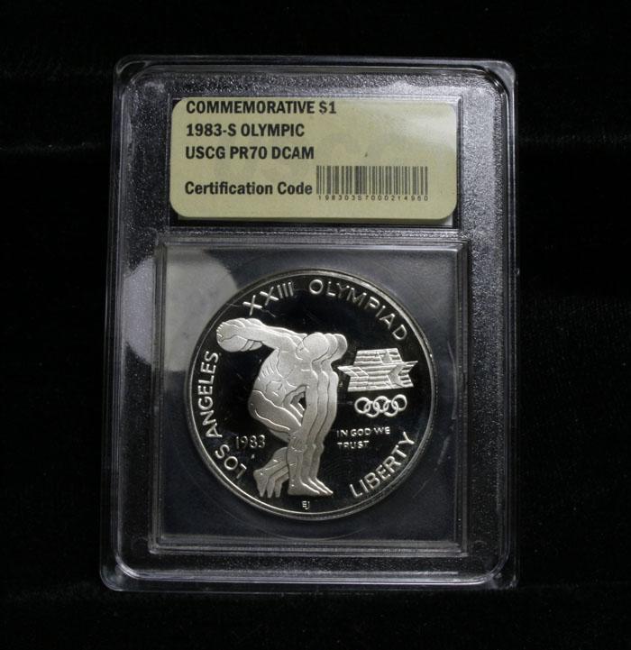 One of three coins minted in 1983 to mark the 1984 Olympic games. PCGS lists the 1983-s in PR70 DCAM at $3400. This example is graded PR70 DCAM by USCG. Estimated Value $300.