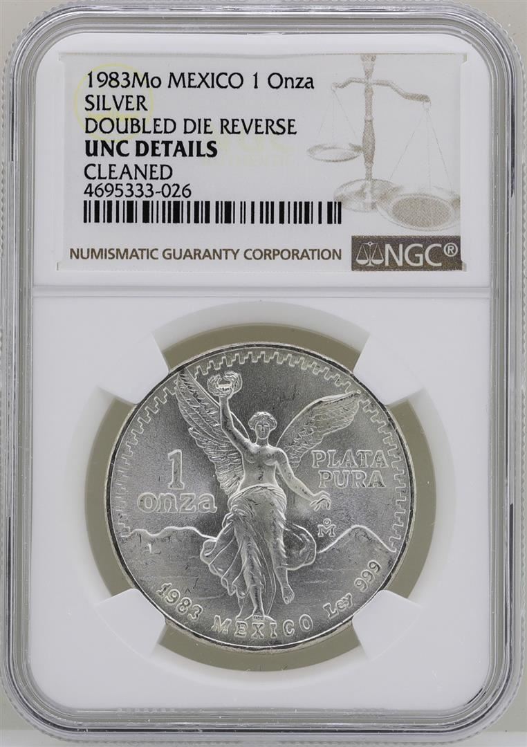 One 1983Mo Mexico Libertad Onza Doubled Die Reverse Silver Coin NGC Unc Details. NGC Certified.