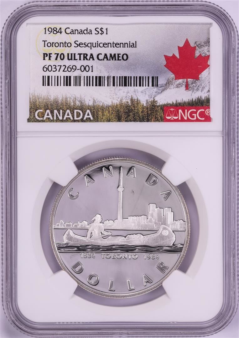 One 1984 $1 Proof Canada Toronto Sesquicentennial Silver Dollar Coin NGC PF70 Ultra Cameo. NGC Certified.