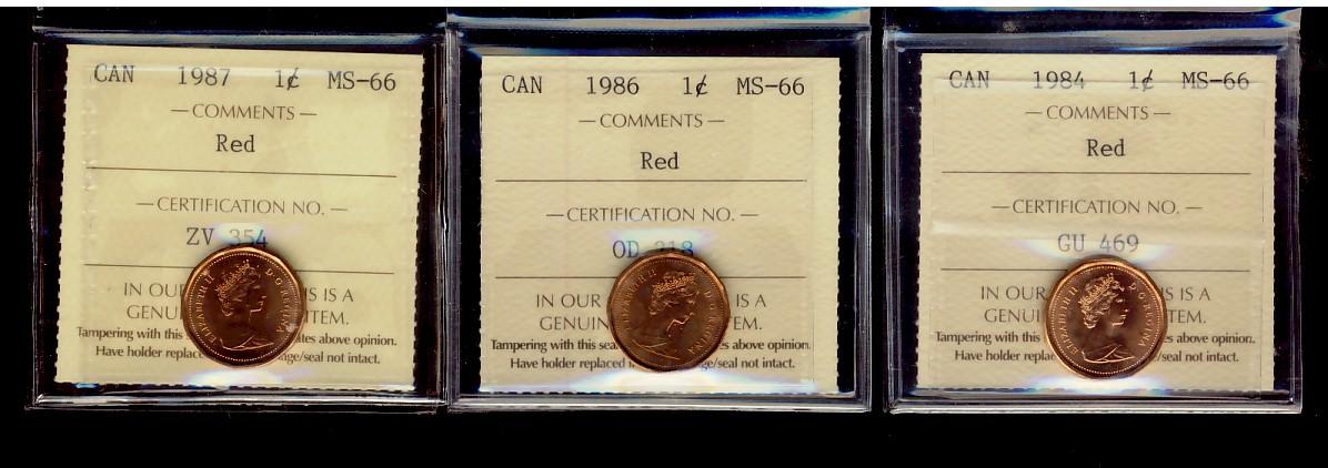 1984, 1986 & 1897 1¢ ICCS MS66RD. Lot of 3 coins.