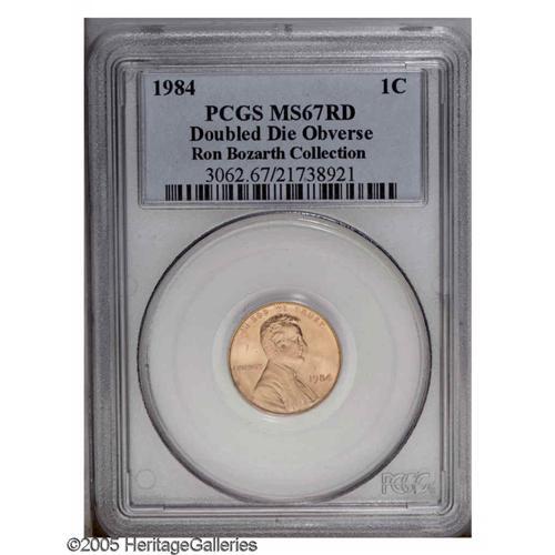 <B>1984<1C> Doubled Die Obverse MS67 Red PCGS.</B></I> Lincoln's ear is widely die doubled southwest. Well struck and highly lustrous with radiant copper-red color. A few tiny gas bubbles beneath the copper plating are as made by the mint.<BR><I>From The Ron Bozarth Registry Collection.</B></I>