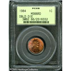 <B>1984 1C Doubled Die Obverse MS66 Red PCGS.</B></I> Lincoln's ear lobe, jaw, and beard are widely die doubled. Luminous pumpkin-orange and rose-red colors endow this lustrous and gorgeously preserved premium Gem. Encapsulated in a green label holder.<BR><I>From The Lonnie Gray Collection of Error Coins.</B></I> Lot:5598
