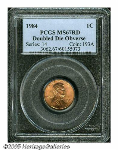 <B>1984<1C> Doubled Die Obverse MS67 Red PCGS.</B></I> FS-037. Booming luster and bright rose-gold color affirm the quality of this well struck Superb Gem. Distributed tiny trapped gas bubbles are always present on authentic Uncirculated pieces.