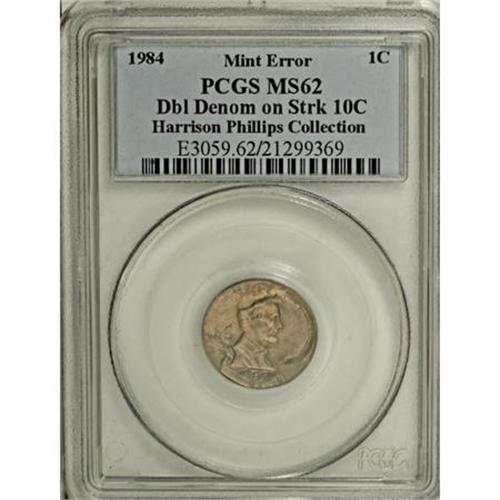<B>1984 1C Lincoln Cent--Double Denomination on Struck Dime--MS62 PCGS.</B></I> Ex: Harrison Phillips Collection. The 1984-P date on the Dime is bold, and all four digits of the date on the Cent are recognizable. Roosevelt's portrait is rotated approximately 60 degrees clockwise relative to Lincoln's. A spectacular silver-gray representative of this popular double denomination error.<BR><BR><B>Coin Engraver:</B> Victor D. Brenner<BR><BR><b>Shipping:</b> Coins & Currency (<a target="_blank" href="http://www.heritageauctions.com/common/shipping.php">view shipping information</a>)