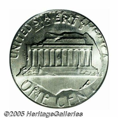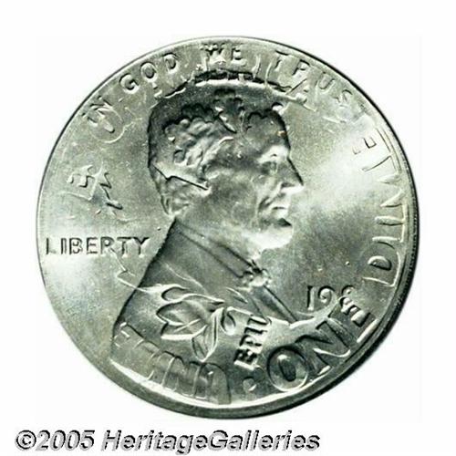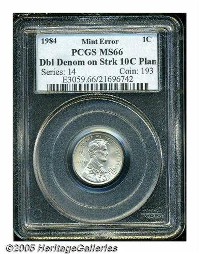 <B>1984<1C> Lincoln Cent--Double Denomination on Struck Dime Planchet--MS66 PCGS.</B></I> The first three digits of the date on the Cent are clearly recognizable, while the fourth (the 4) cannot be detected by this cataloger. Perhaps the date is deduced by a progression of other double denominations seen of this year. Roosevelt's portrait is rotated approximately 80 degrees clockwise relative to Lincoln's. A dramatic and always popular error.