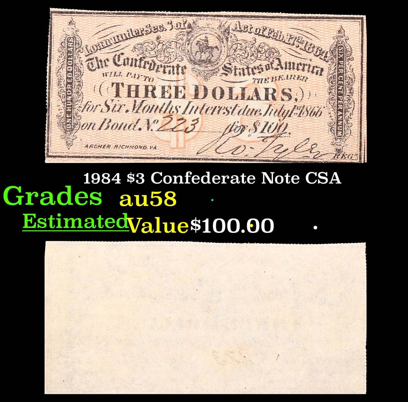 1984 $3 Confederate Note CSA Grades Choice AU/BU Slider. 0