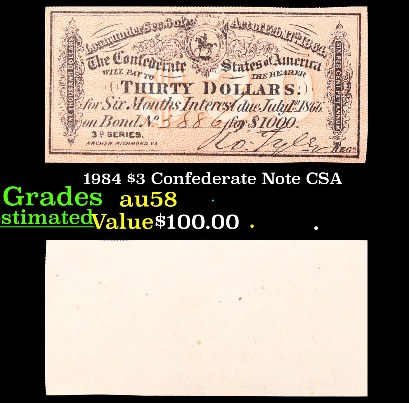 1984 $3 Confederate Note CSA Grades Choice AU/BU Slider. 0
