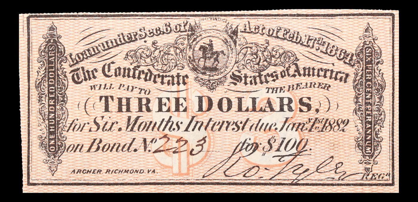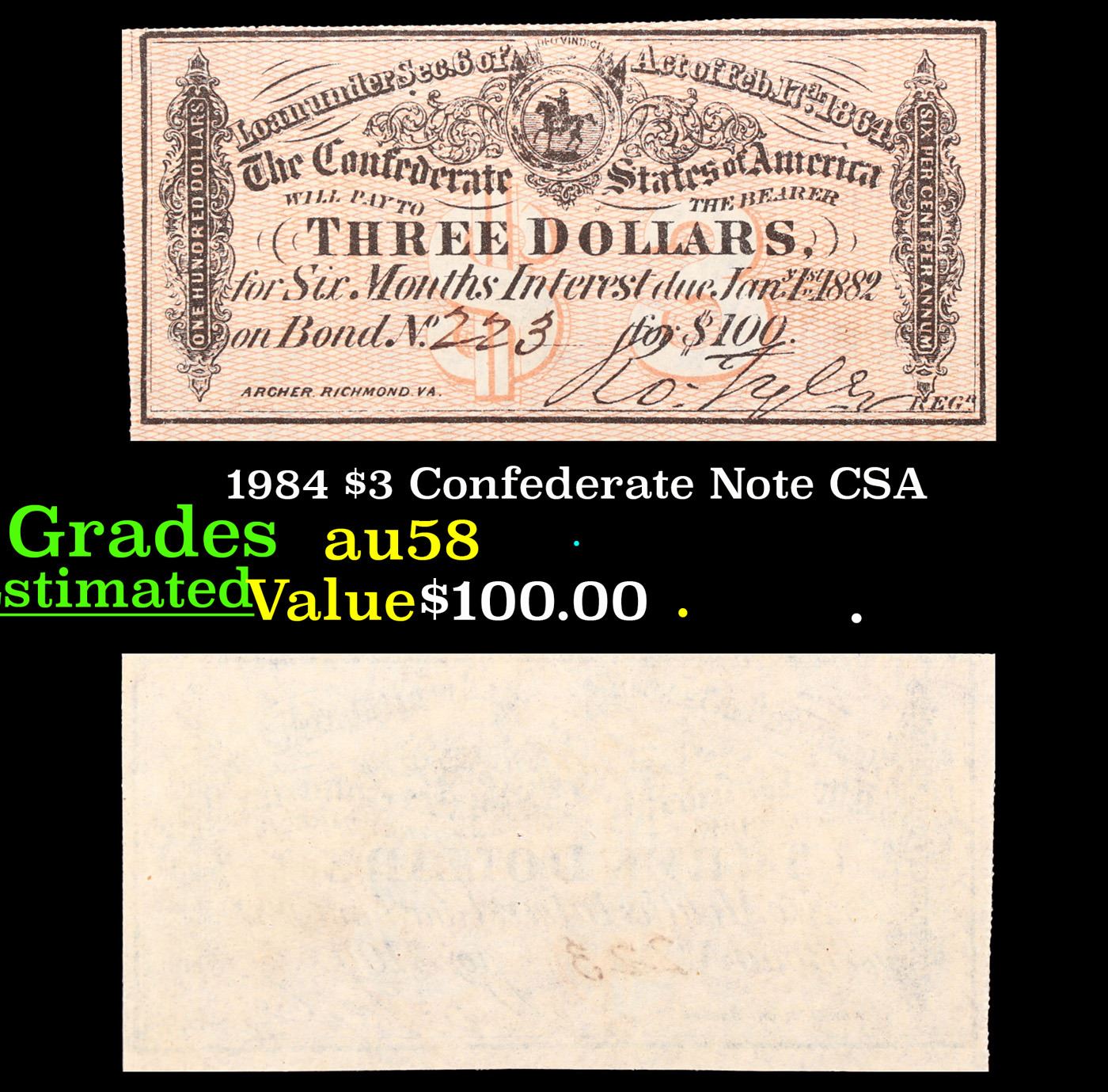1984 $3 Confederate Note CSA Grades Choice AU/BU Slider. 0