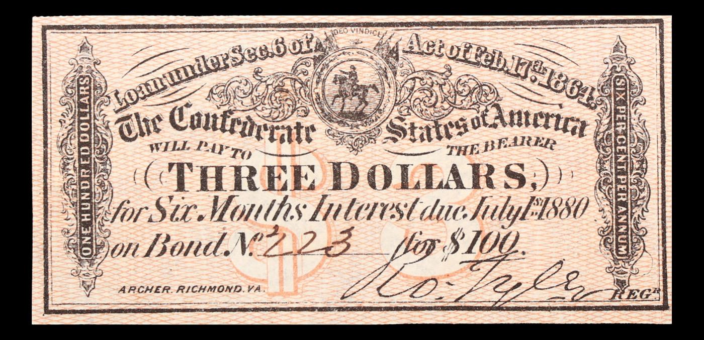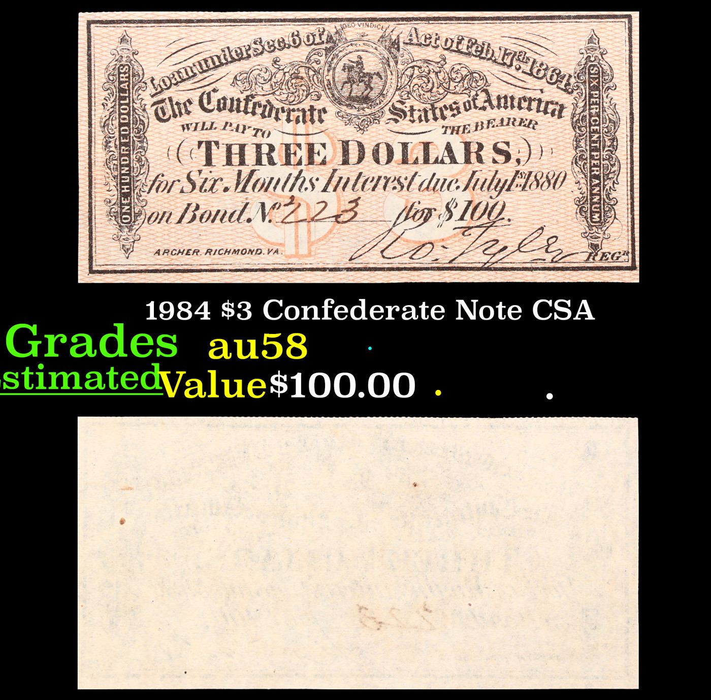 1984 $3 Confederate Note CSA Grades Choice AU/BU Slider. 0