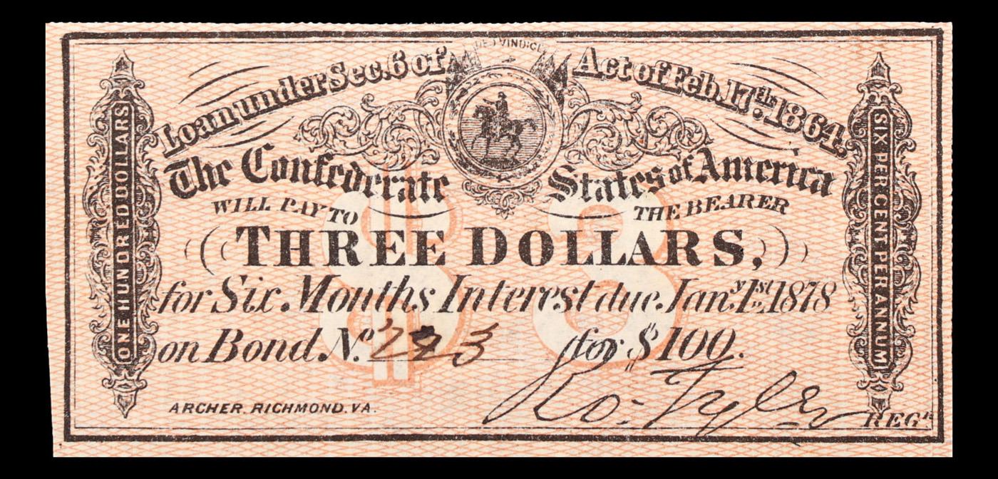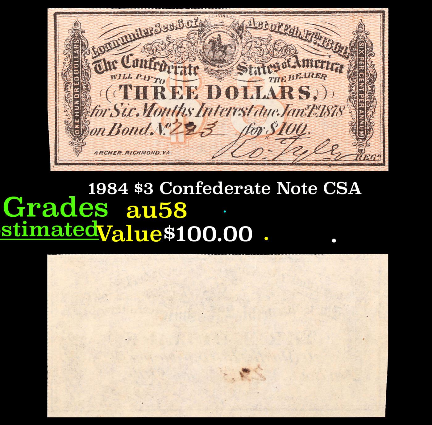 1984 $3 Confederate Note CSA Grades Choice AU/BU Slider. 0
