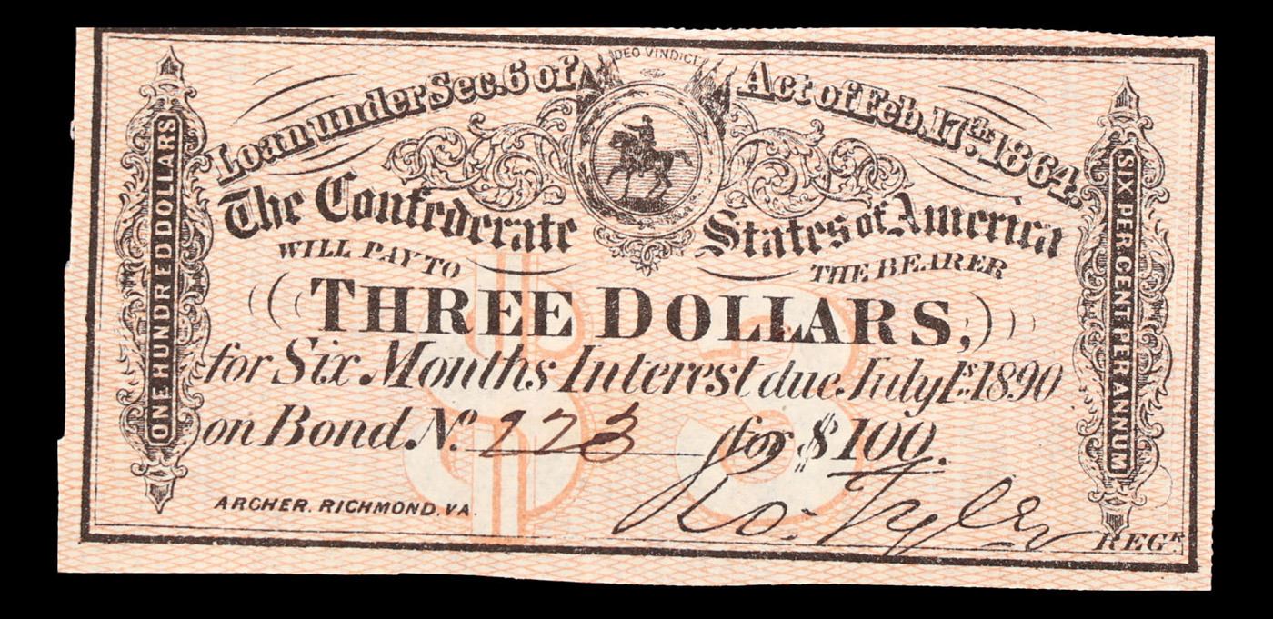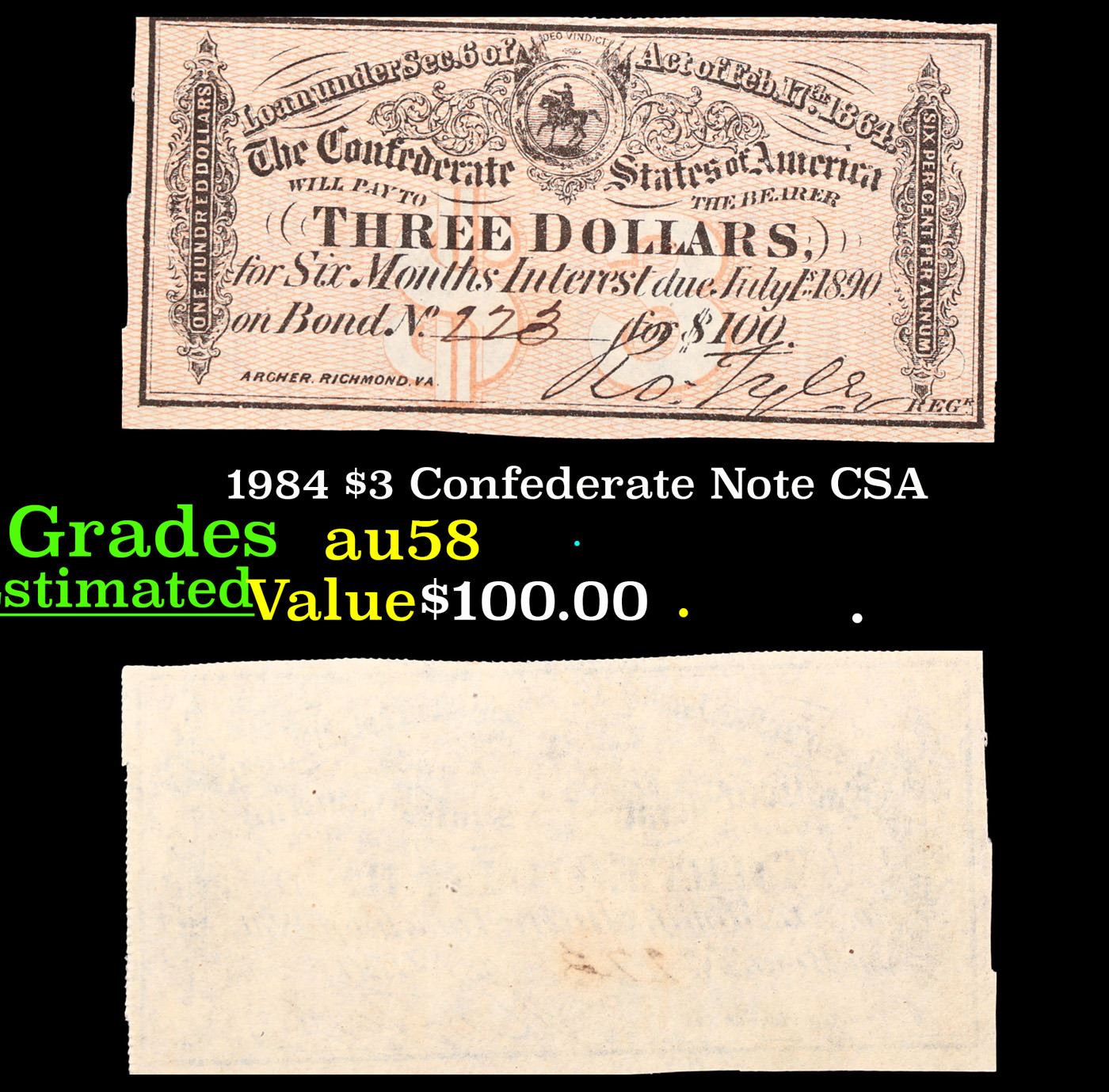1984 $3 Confederate Note CSA Grades Choice AU/BU Slider. 0