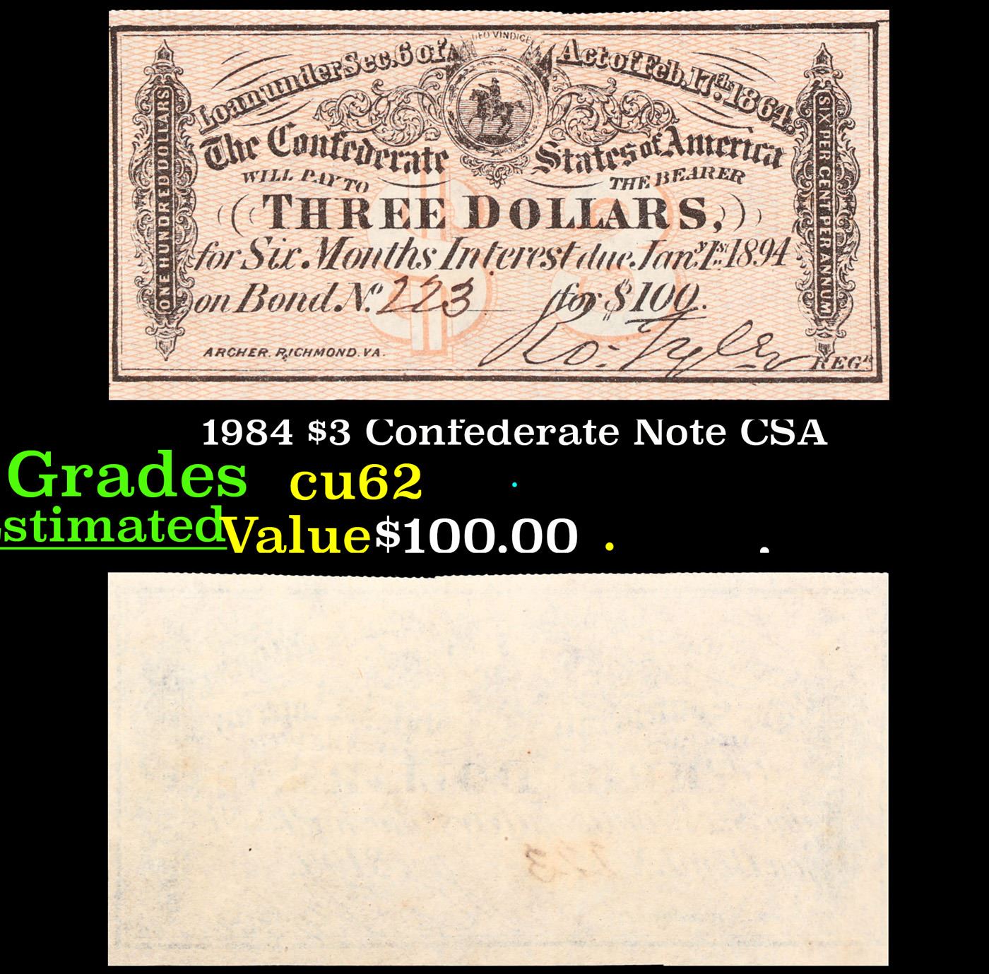 1984 $3 Confederate Note CSA Grades Select CU. 0