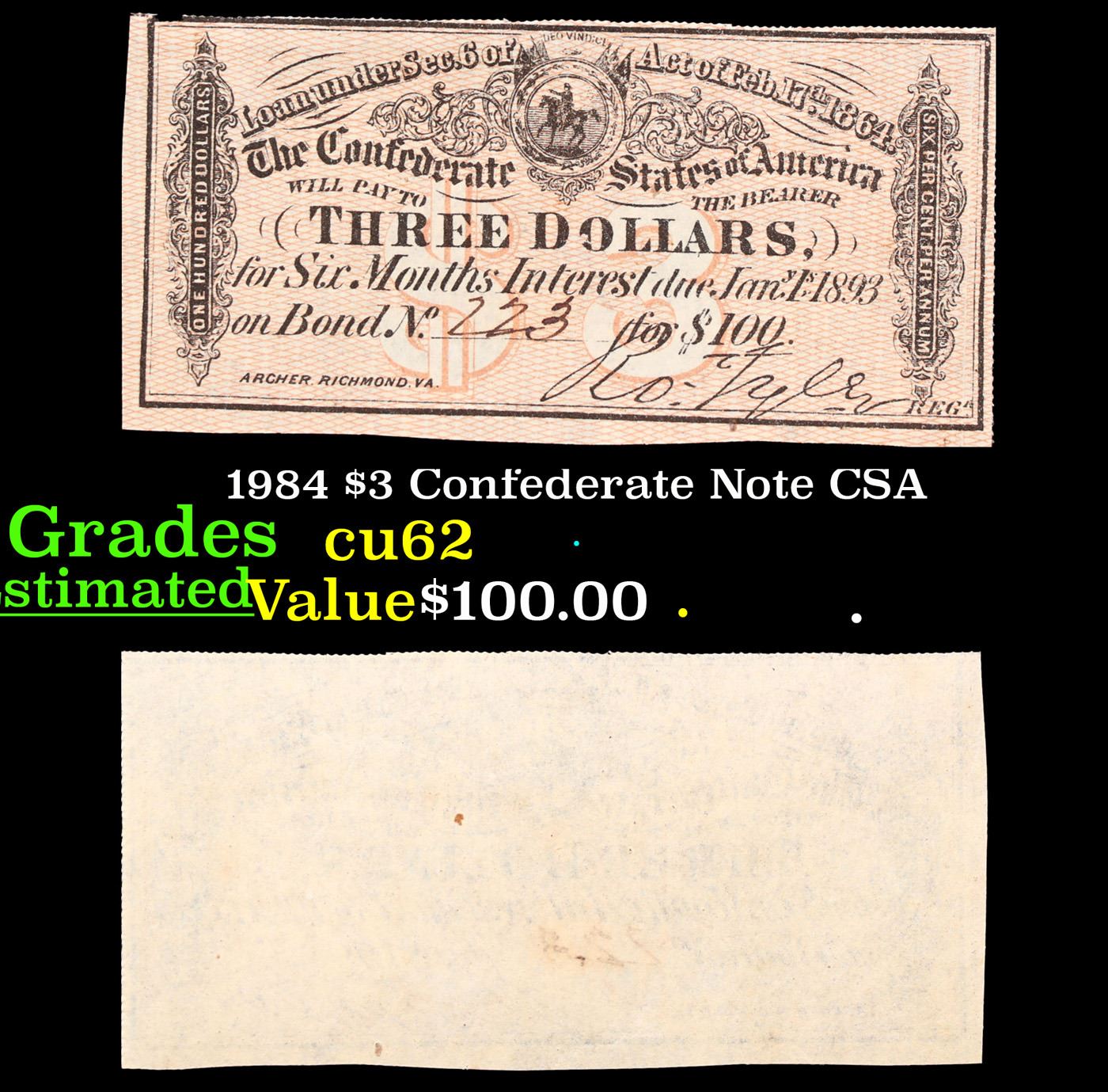1984 $3 Confederate Note CSA Grades Select CU. 0