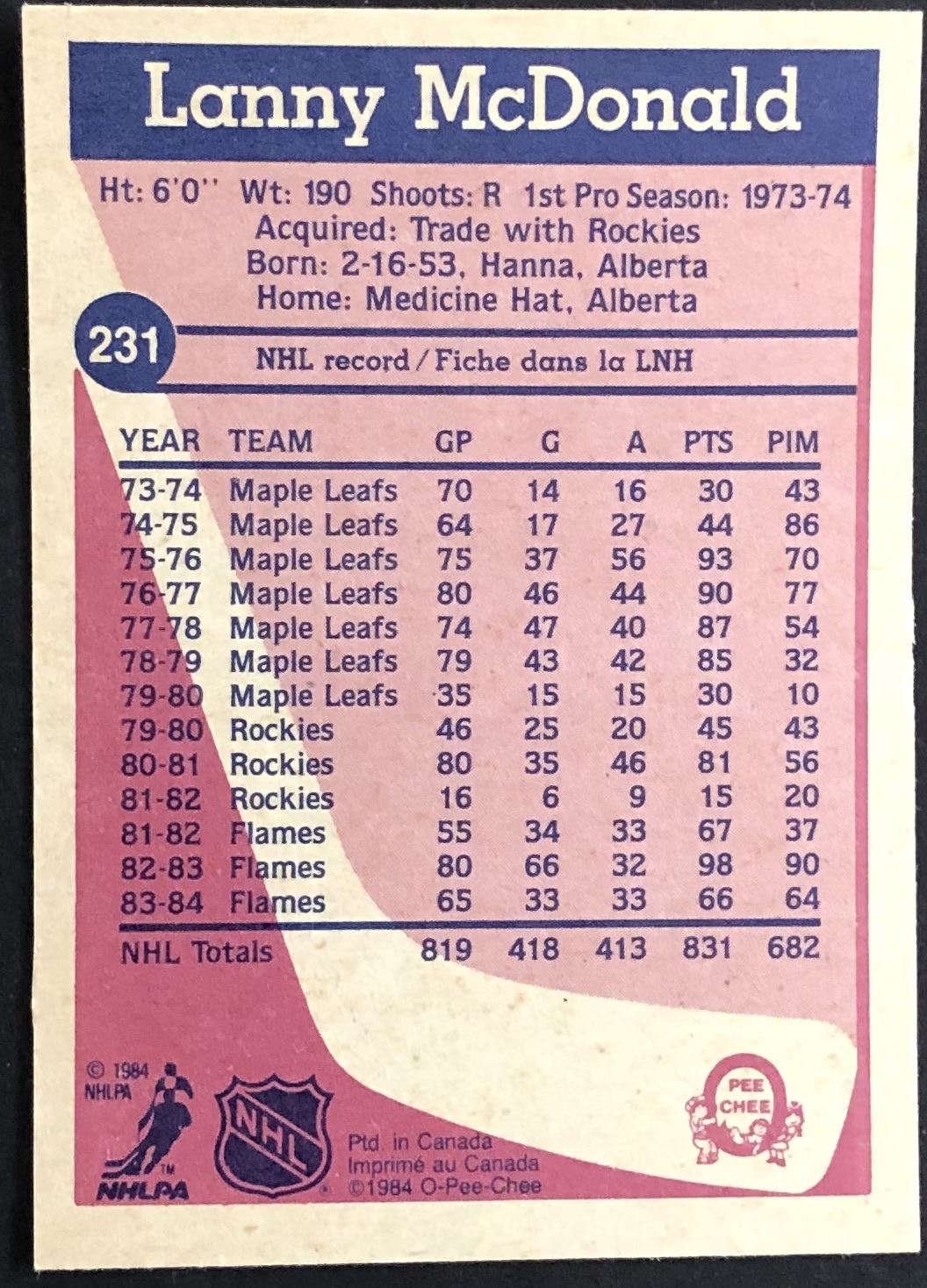 Card #231 NHL, hockey, vintage, hall of fame, OPC