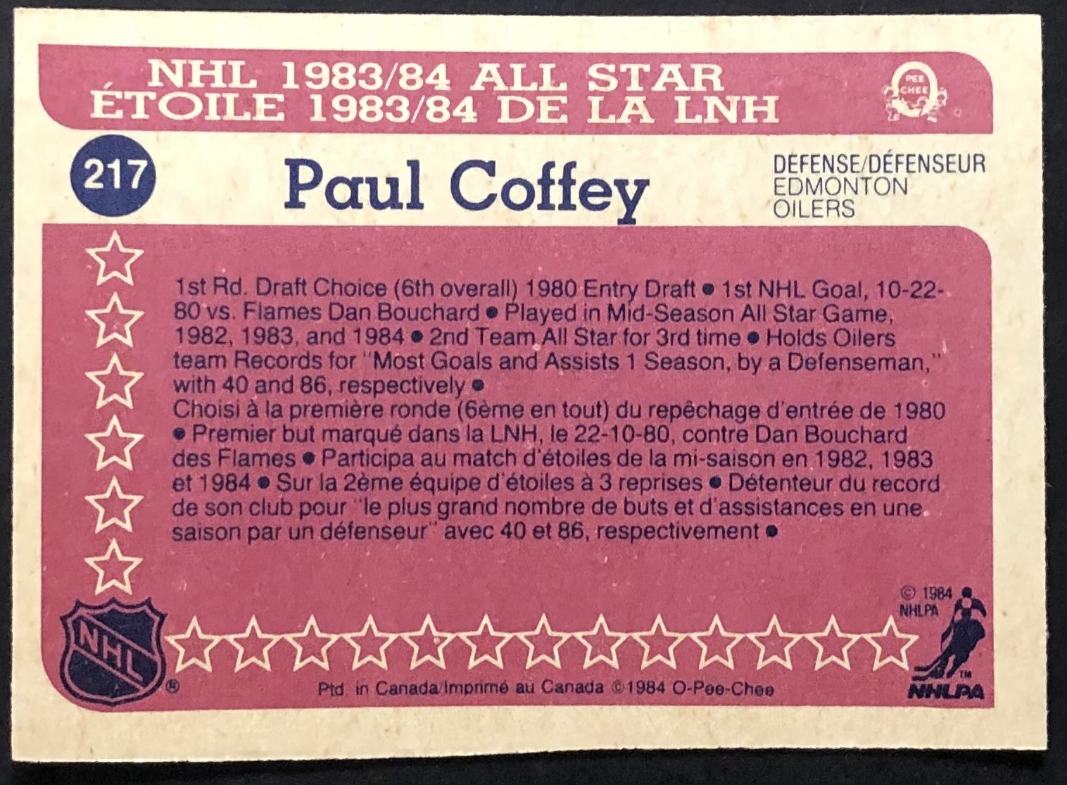 Card #217 NHL, hockey, vintage, hall of fame, OPC