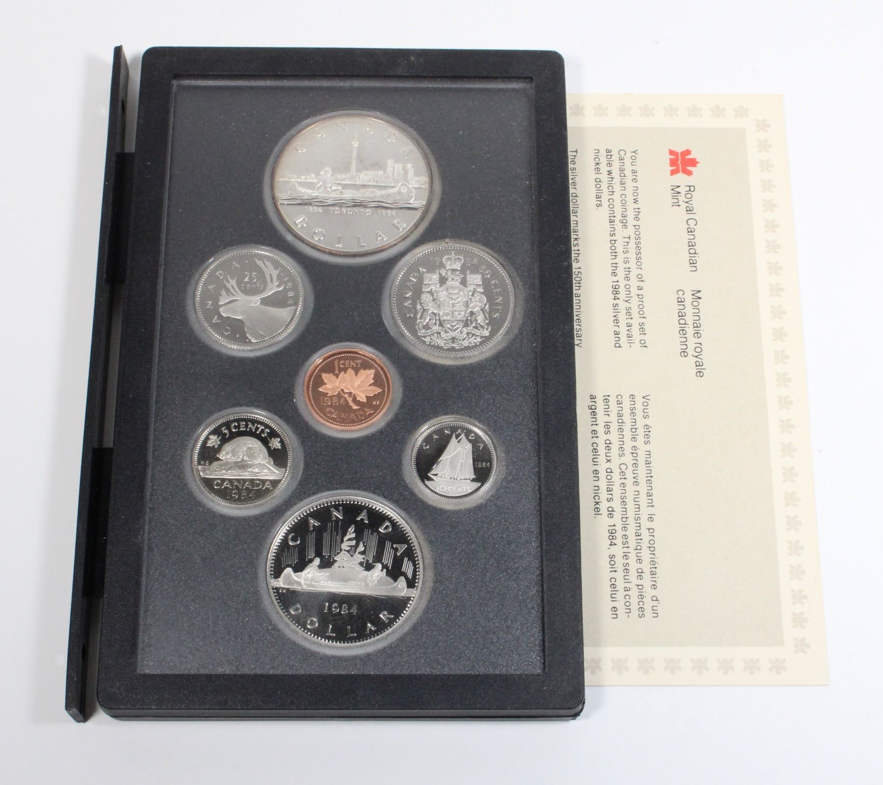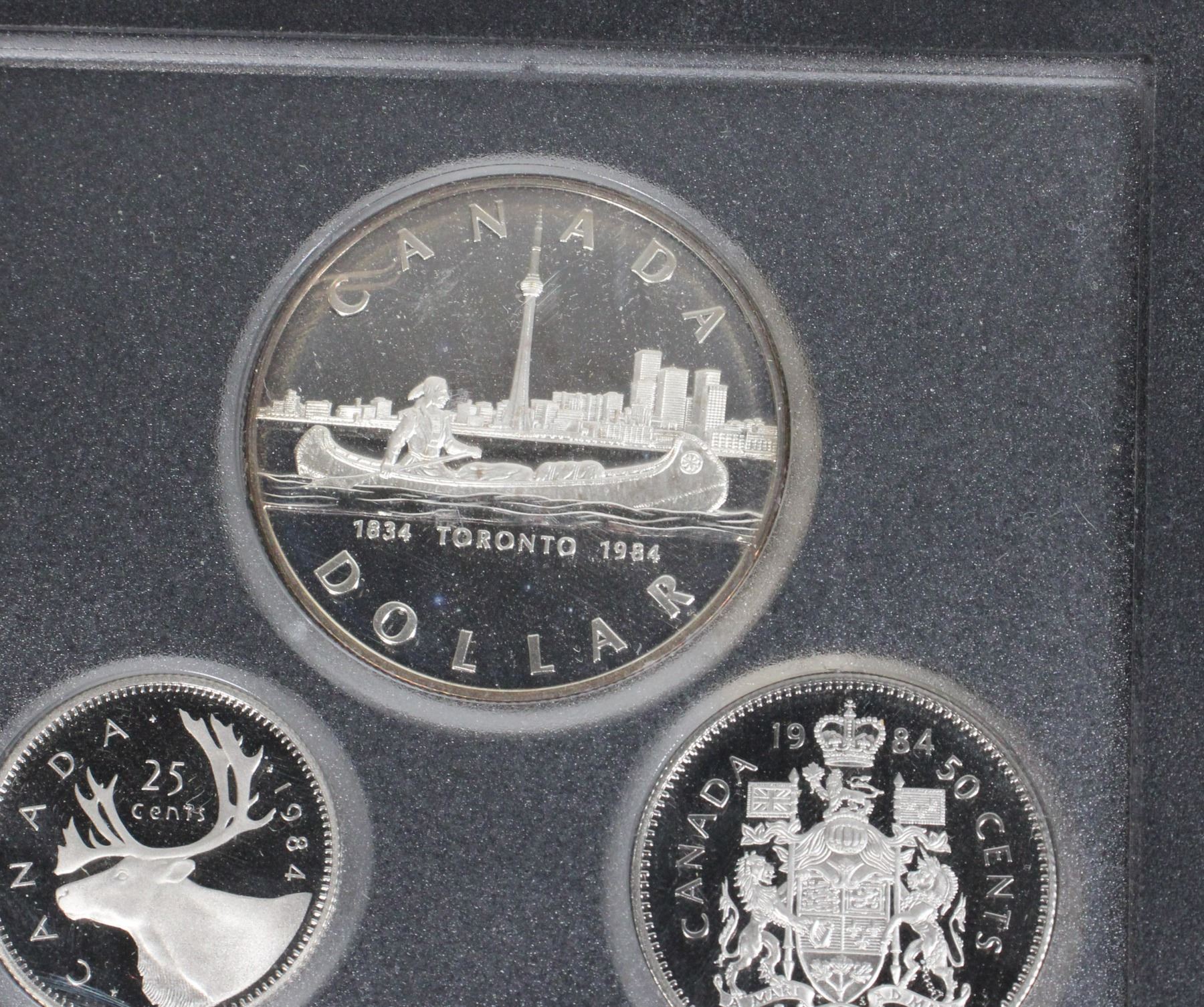 LARGER DOLLAR IS SILVER AND CELEBRATES 150TH ANNIVERSARY OF THE CITY OF TORONTO. COMES WITH PAPERWORK. ORIGINAL BOOK CASE MISSING