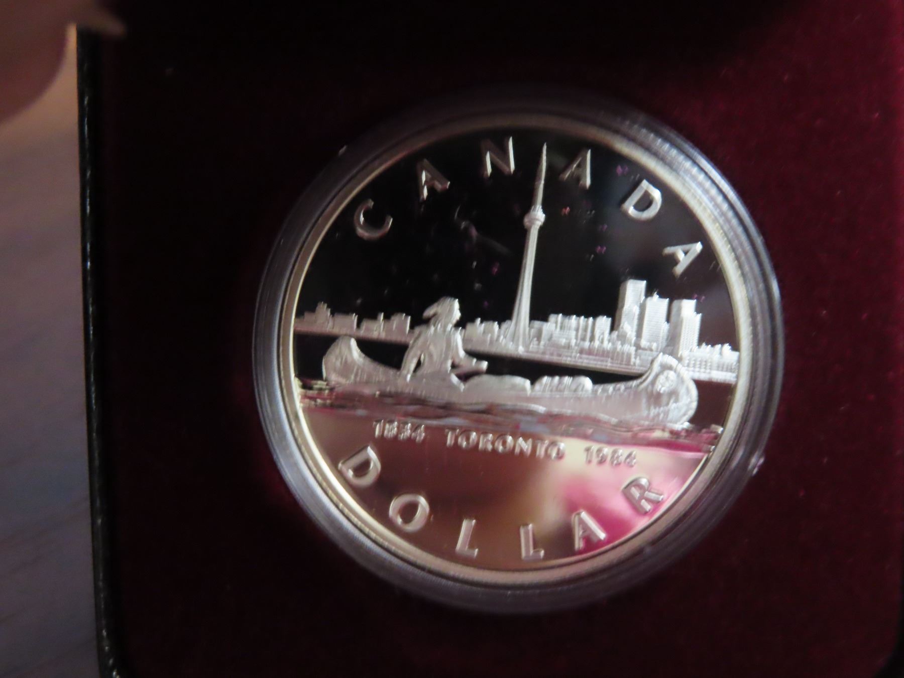 1984 Canadian Proof Silver Dollar. Commemorates the founding of Toronto. Ultra Heavy Cameo. Housed in its original Royal Canadian Mint case of issue.