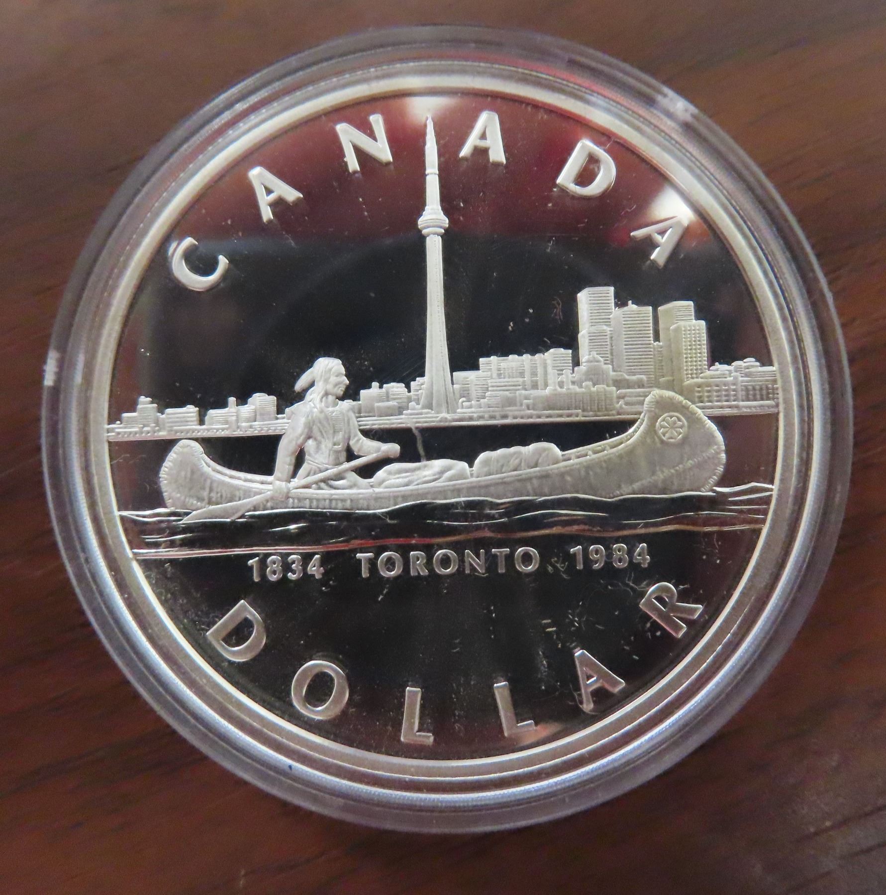 1984 Canadian Silver Dollar. Commemorates the 150th Anniversary of Toronto. Proof with Ultra Heavy Cameo. Housed in its original Royal Canadian Mint case of issue.