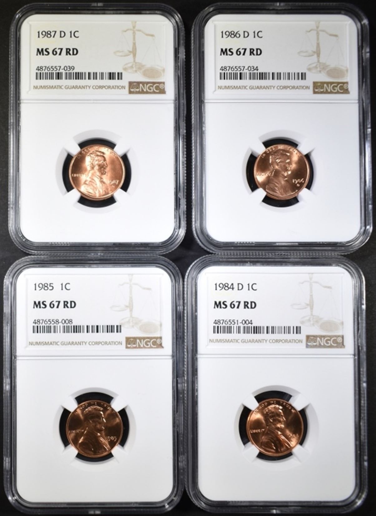 1984-D, 85, 86-D, 87-D LINCOLN CENTS NGC MS-67 RED