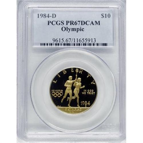 <B>1984-D G$10 Olympic Gold Ten Dollar PR67 Deep Cameo PCGS.</B></I> PCGS Population (36/1237). NGC Census: (0/11). Mintage: 34,533. Numismedia Wsl. Price for NGC/PCGS coin in PR67: $340. (#9615)<BR><BR><b>Shipping:</b> Coins & Currency (<a target="_blank" href="http://www.heritageauctions.com/common/shipping.php">view shipping information</a>)