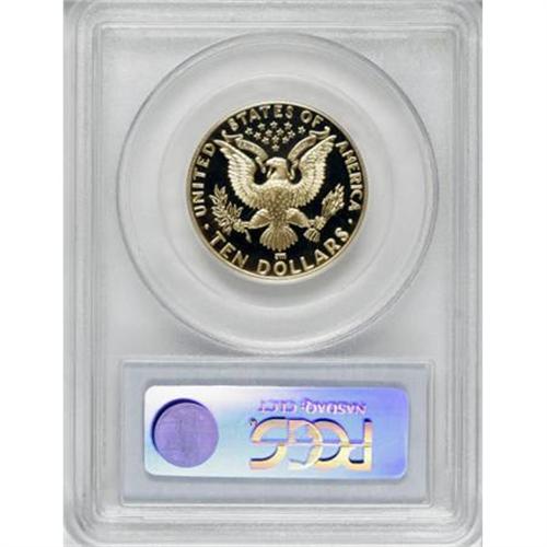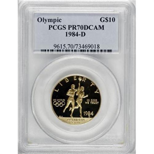 <B>1984-D G$10 Olympic Gold Ten Dollar PR70 Deep Cameo PCGS.</B></I> The gleaming mirrors and richly frosted devices supply absolute black-and-gold contrast on this impressive specimen. A perfect representative of the only modern gold commemorative proof struck at Denver, which has a net mintage of only 34,533 pieces. This is one of just 12 examples assigned the ultimate grade by PCGS (3/08).<BR><BR><b>Shipping:</b> Coins & Currency (<a target="_blank" href="http://www.heritageauctions.com/common/shipping.php">view shipping information</a>)