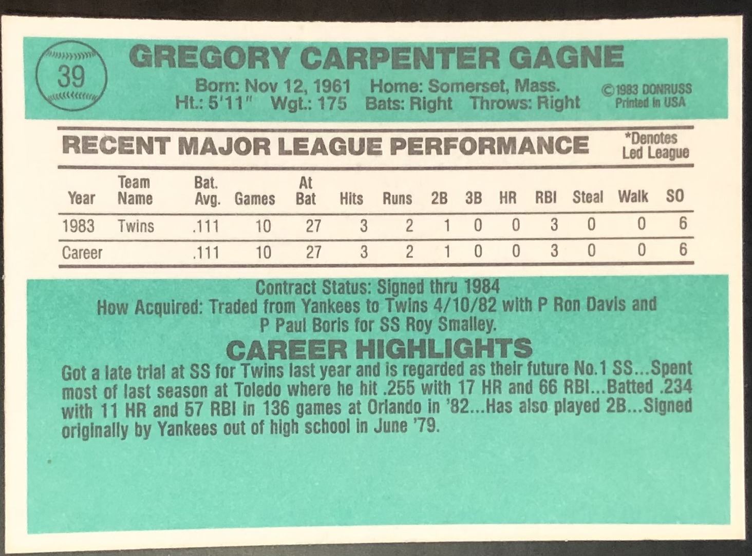 Card #39 vintage, MLB, baseball, rookie