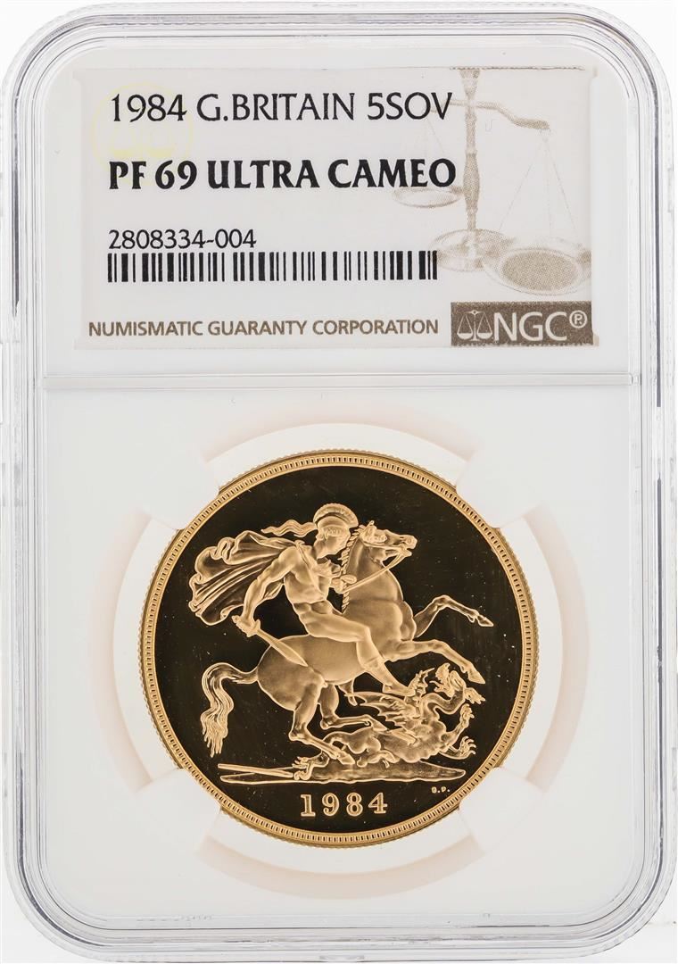 One 1984 Great Britain 5 Sovereign Gold Coin NGC PF69 Ultra Cameo. NGC Certified.