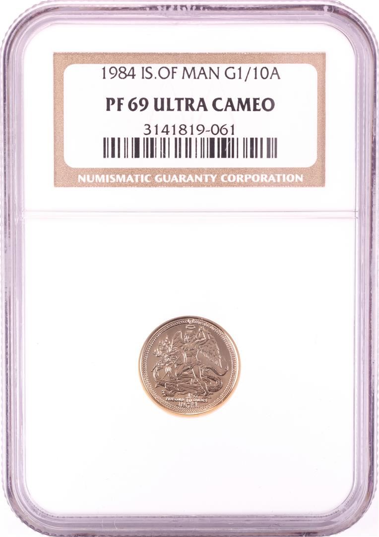 One 1984 Isle of Man Proof 1/10 oz. Gold Coin NGC PF69 Ultra Cameo. NGC Certified.