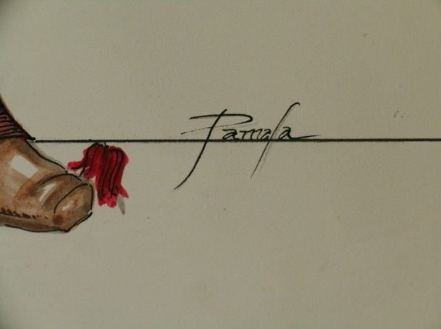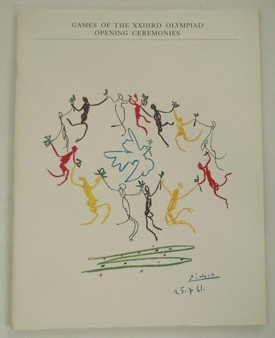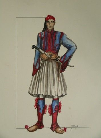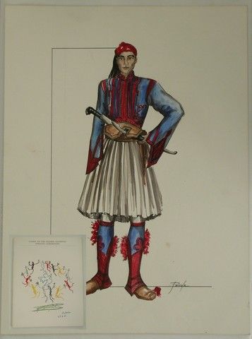 A unique and rare collectable for the much loved 1984 Summer Olympic Games in Los Angeles. This is an original drawing for a Fustanella, the traditional skirt-like garment worn by both guard and ceremonial military units in the Balkans and Albania. This beautifully realized full color drawing was created by fashion designer Pamala exclusively for the International Parade of 140 Nations at the famous Opening Ceremonies. It also includes the Official Original Program of the 1984 Olympics (July 28th, 1984 to August 12th, 1984). The Fustanella, style costume drawing is 15" x 20", and the Program is 8.5" x 11". Acquired by one of the officials who worked on the 1984 Olympics.