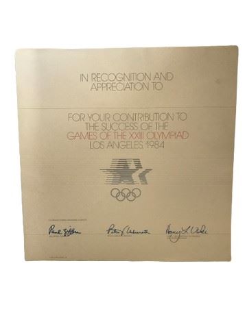Certificate states “In recognition and appreciation to ____ for your contribution to the success of the games of the XXIII Olympiad Los Angeles, 1984.”