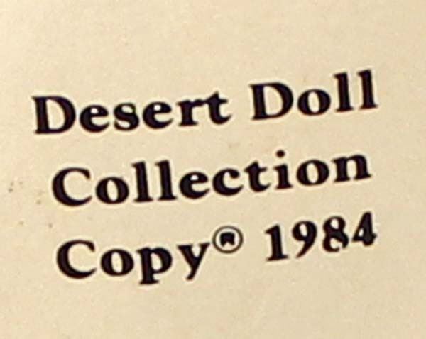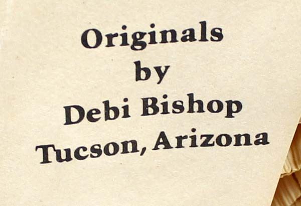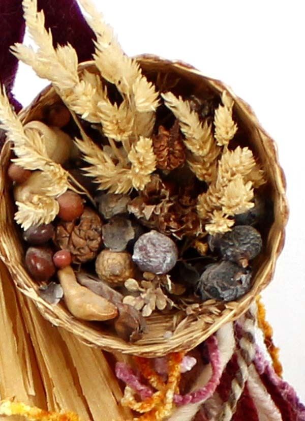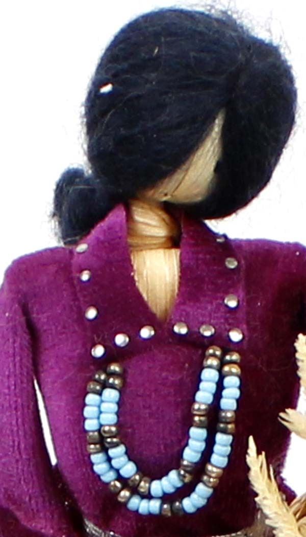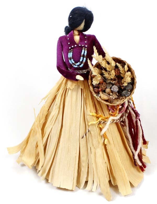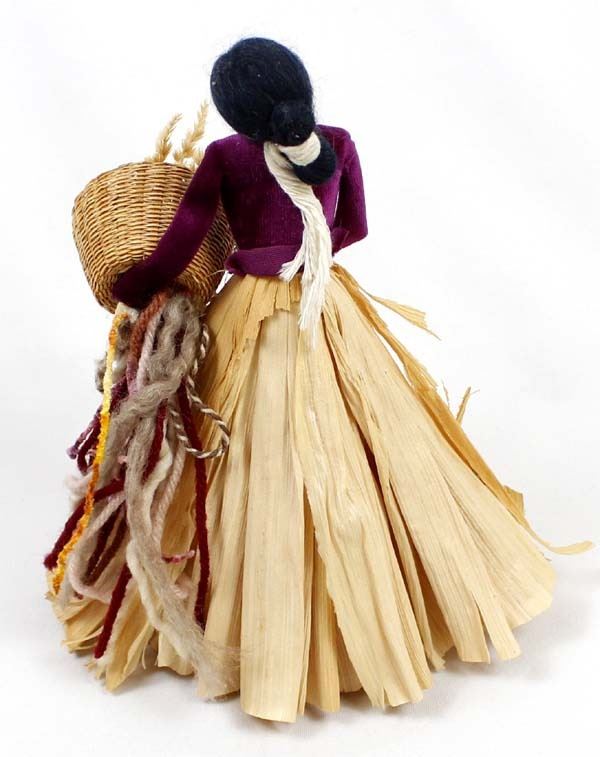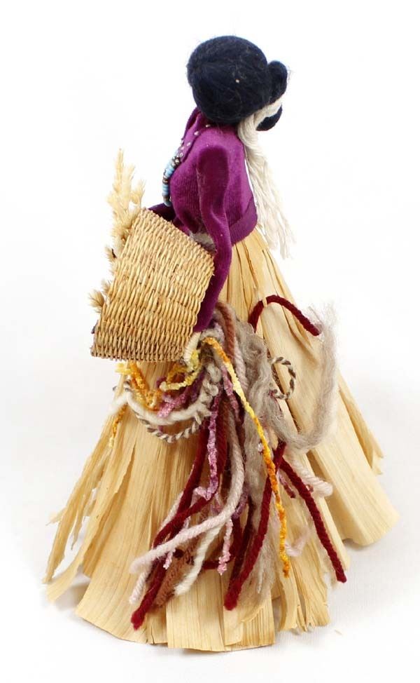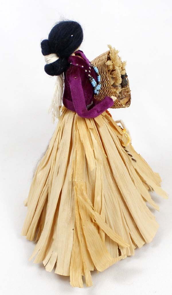 1984 Navajo Style Corn Husk Doll by Debi Bishop from her Desert Doll Creations, measures 5'' x 10'' x 7'', doll is wearing velvet top, beaded necklace, has wool hair and is carrying a basket of dried flowers, card attached on the bottom