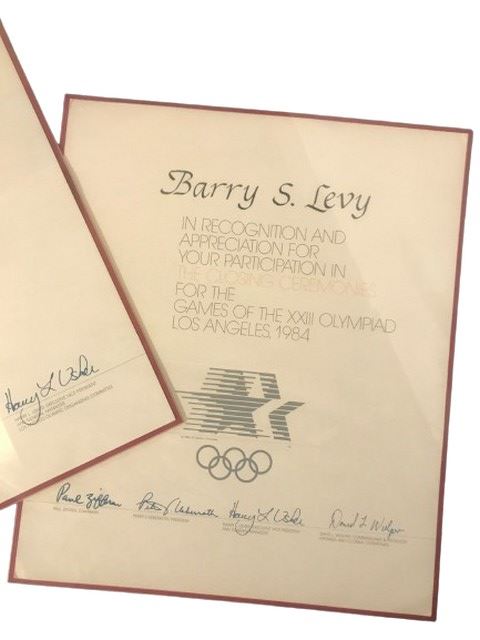 Three Framed certificates of appreciation issued to Barry S. Levy, who was a torch bearer in the 1984 Olympics. The certificates read: