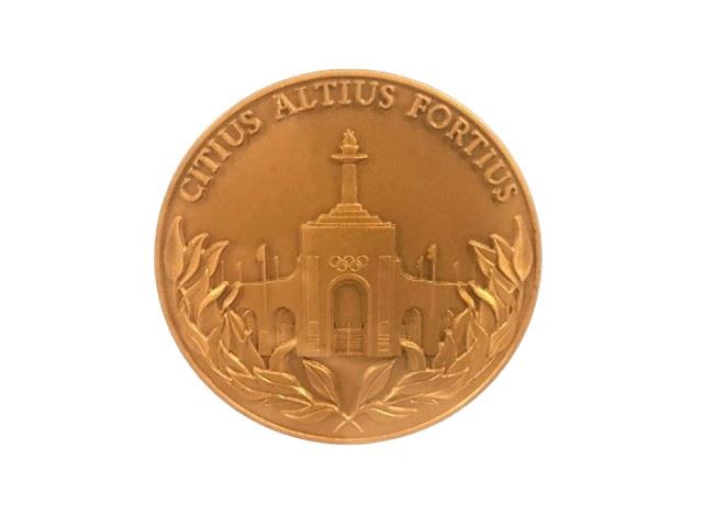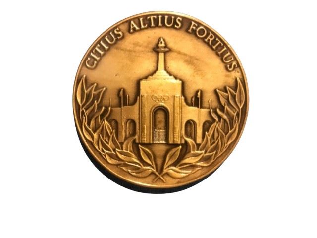 The frame contains four bronze medals, featuring details of the Los Angeles Colosseum, and the Stars in Motion emblem designed for the 1984 Summer games.
