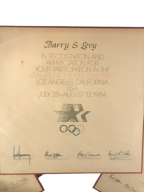“In recognition and appreciation for your participation in the games of the 23rd Olympiad Los Angeles California USA July 28 – August 12, 1984.