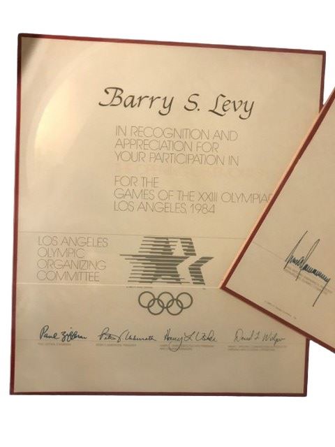 Three Framed certificates of appreciation issued to Barry S. Levy, who was a torch bearer in the 1984 Olympics. The certificates read: