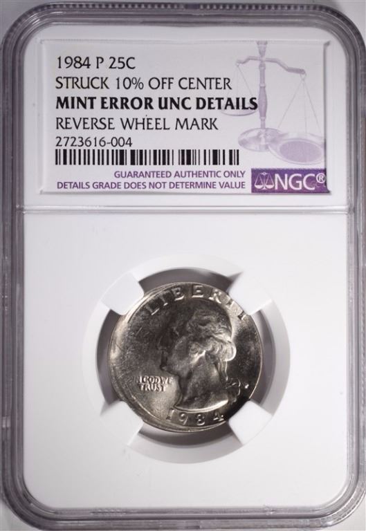 1984-P MINT ERROR ( STRUCK 10% OFF CENTER ) WASHINGTON QUARTER, NGC UNC DETAILS ESTIMATE $250 - $275.