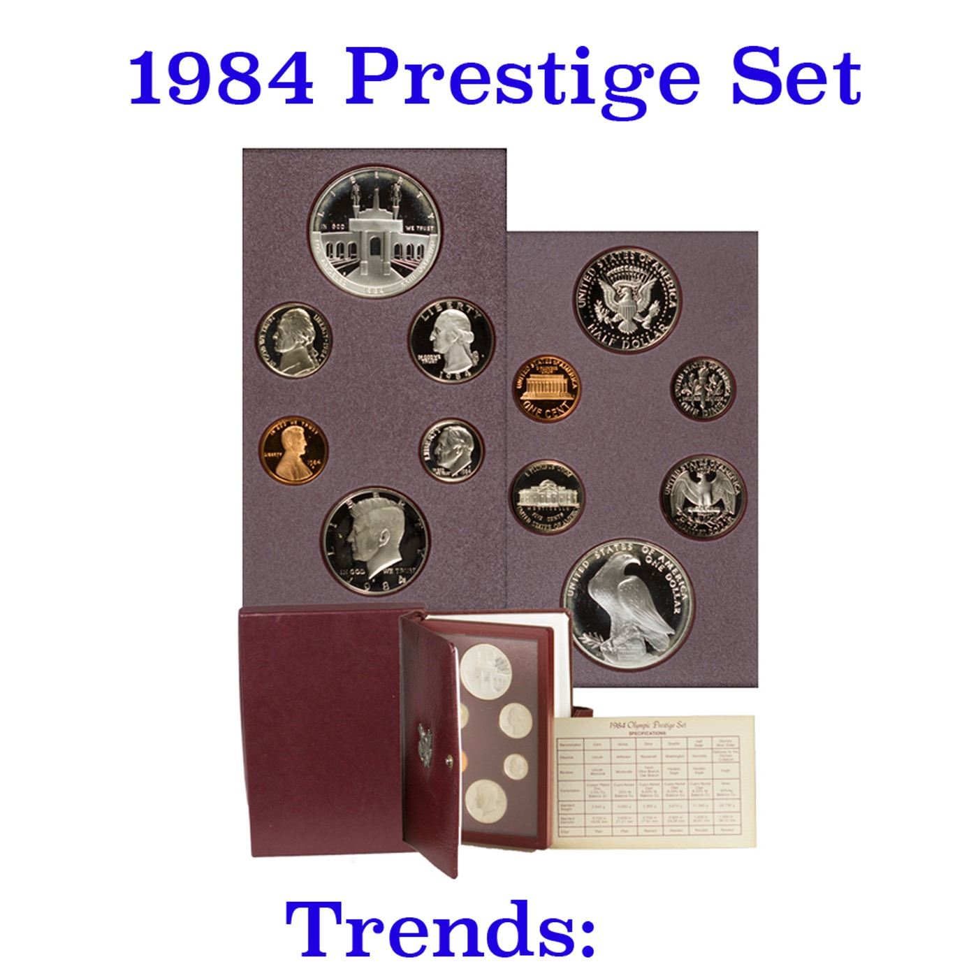 1984 Prestige Proof Set - Last set in the Leather Binder. Housed in a beautiful Leather Binder, this set includes the 90% silver "Gateway to the Olympic Coliseum" Olympic coin. Very difficult set to Locate. About 1oz of pure Silver