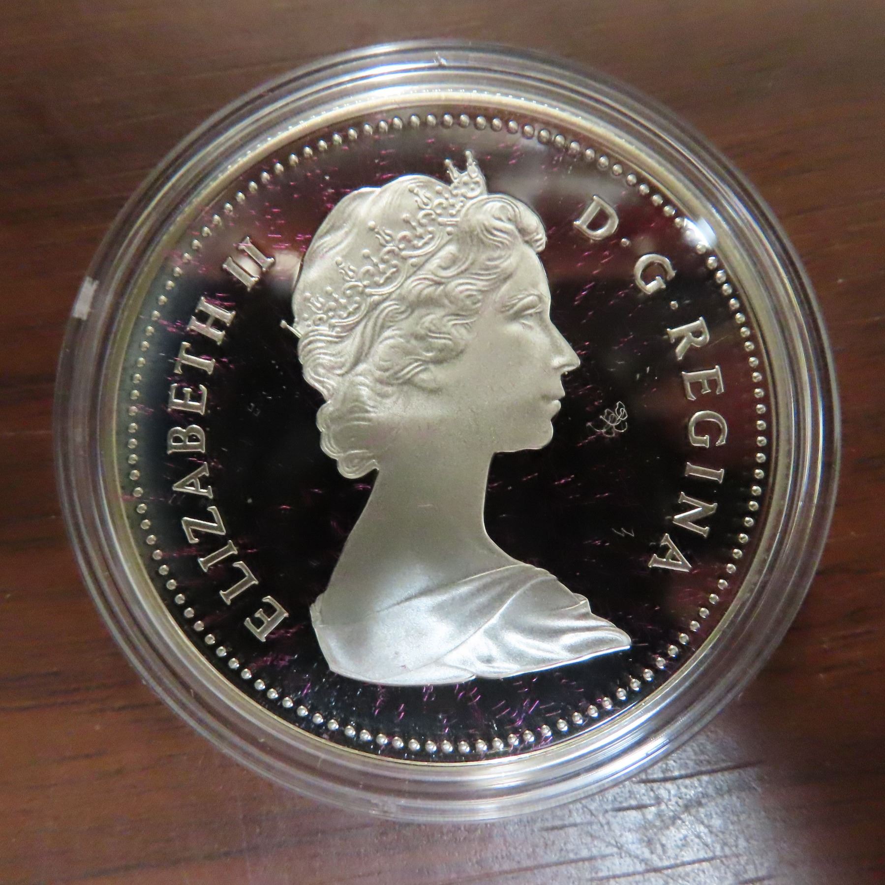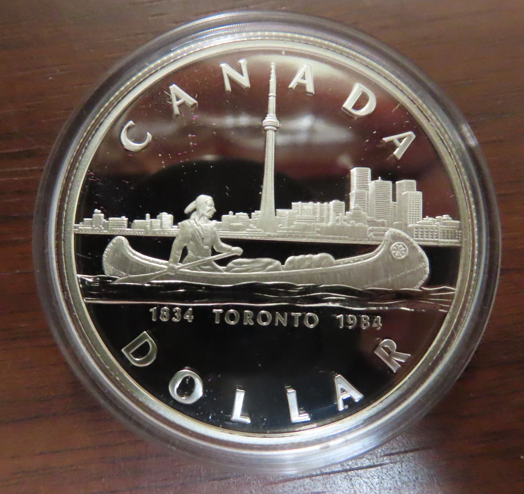 1984 Proof Silver Dollar. Commemorates the 150th Anniversary of Toronto. Popular CN Tower. Housed in its original Royal Canadian Mint case of issue. Bright White.