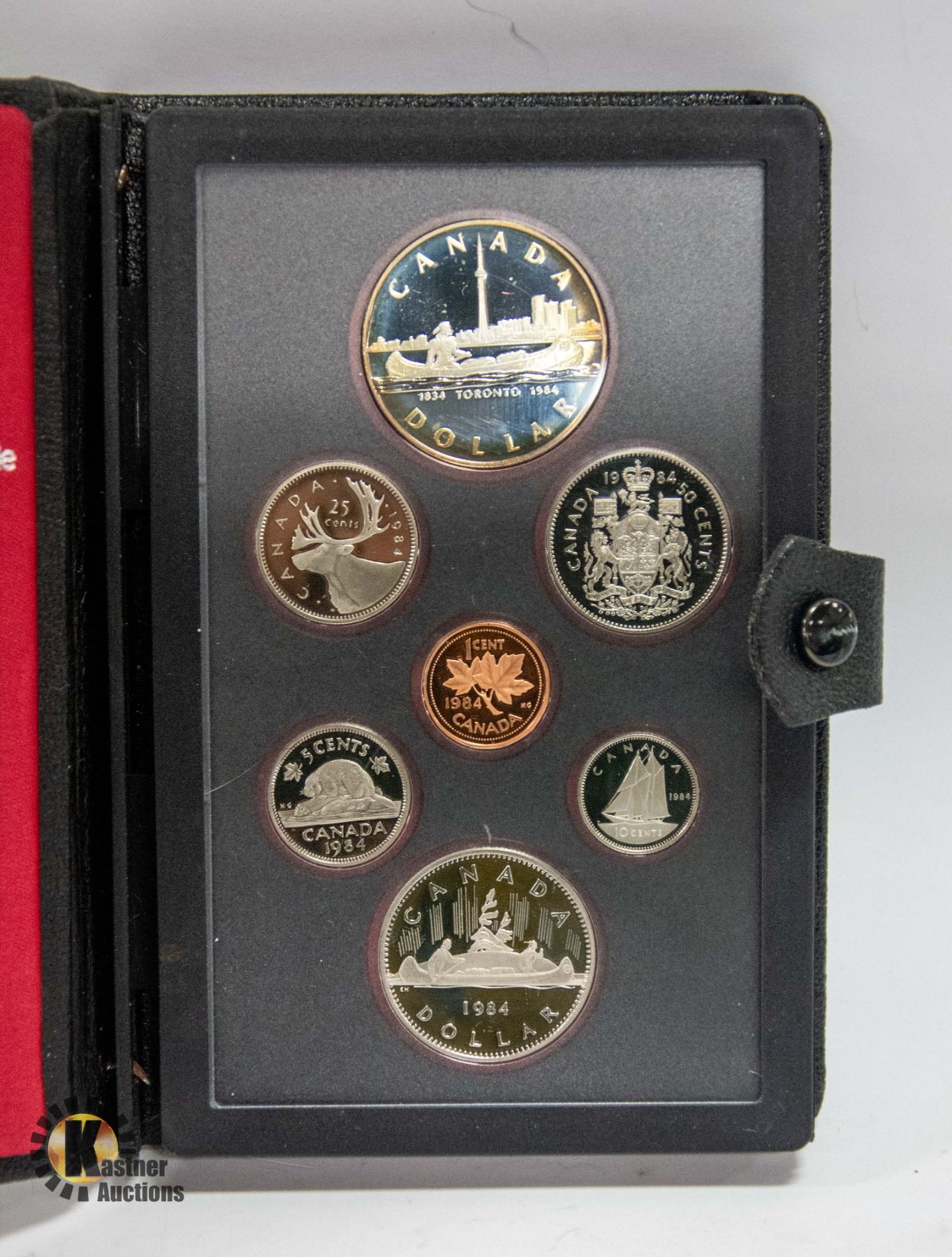 SEVEN COIN PROOF SET WITH ONE COMMEMORATIVE SILVER DOLLAR. MAPLE LEAF, BLACK CARD BOARD BOX BOOK TYPE WITH CLASP. RED SATIN INSIDE VOYAGEUR/TORONTO. **ALL ITEMS MUST BE REMOVED BY 5PM SATURDAY, FEBRUARY 10TH 2024. ALL REMAINING ITEMS WILL BE SUBJECT TO A $6.00 PER DAY STORAGE CHARGE. ANY ITEMS REMAINING AFTER MONDAY, FEBRUARY 26TH, 2023 WILL BE CONSIDERED FORFEITED. NO REFUNDS WILL BE ISSUED FOR FORFEITED ITEMS. TO SCHEDULE A PICK UP APPOINTMENT CLICK HERE
