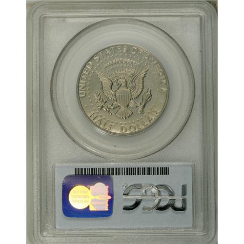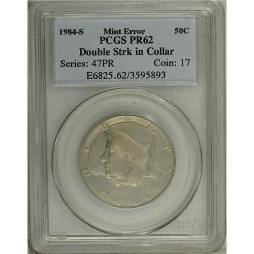 <B>1984-S 50C Kennedy Half--Double Struck in Collar--PR62 PCGS.</B></I> A remarkable proof half dollar error from the Orwellian year of 1984. Technically, all modern proofs are double struck in collar. This piece is special, however, since the obverse (hammer) die rotated <B>nearly 90 degrees</B></I> counterclockwise between blows from the die. The reverse (anvil) die remained fixed between strikes. Presumably, the hammer die was very loose. Proofs are subject to levels of inspection at the mint, and obvious errors that escape mint vigilance are rare.<BR><BR><b>Shipping:</b> Coin/Currency (<a target="_blank" href="http://www.heritageauctions.com/common/shipping.php">view shipping information</a>)
