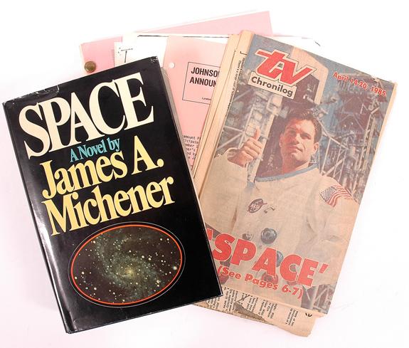 1984, "SPACE" Movie Memorabilia. A fascinating group of memorabilia relating to the movie. Included is a 1984 NASA-JSC "Announcement from the Director of Public Affairs" that reads: "Extras Required - Paramount's SPACE Production" stating that applications are being accepted for movie extras to appear in the movie "Space", based on James Mitchner's novel by the same name. The "fifth" part of the mini-series was to be filmed at JSC. The all-star cast was to include James Garner, Michael York, Blair Brown, Bruce Dern, etc.